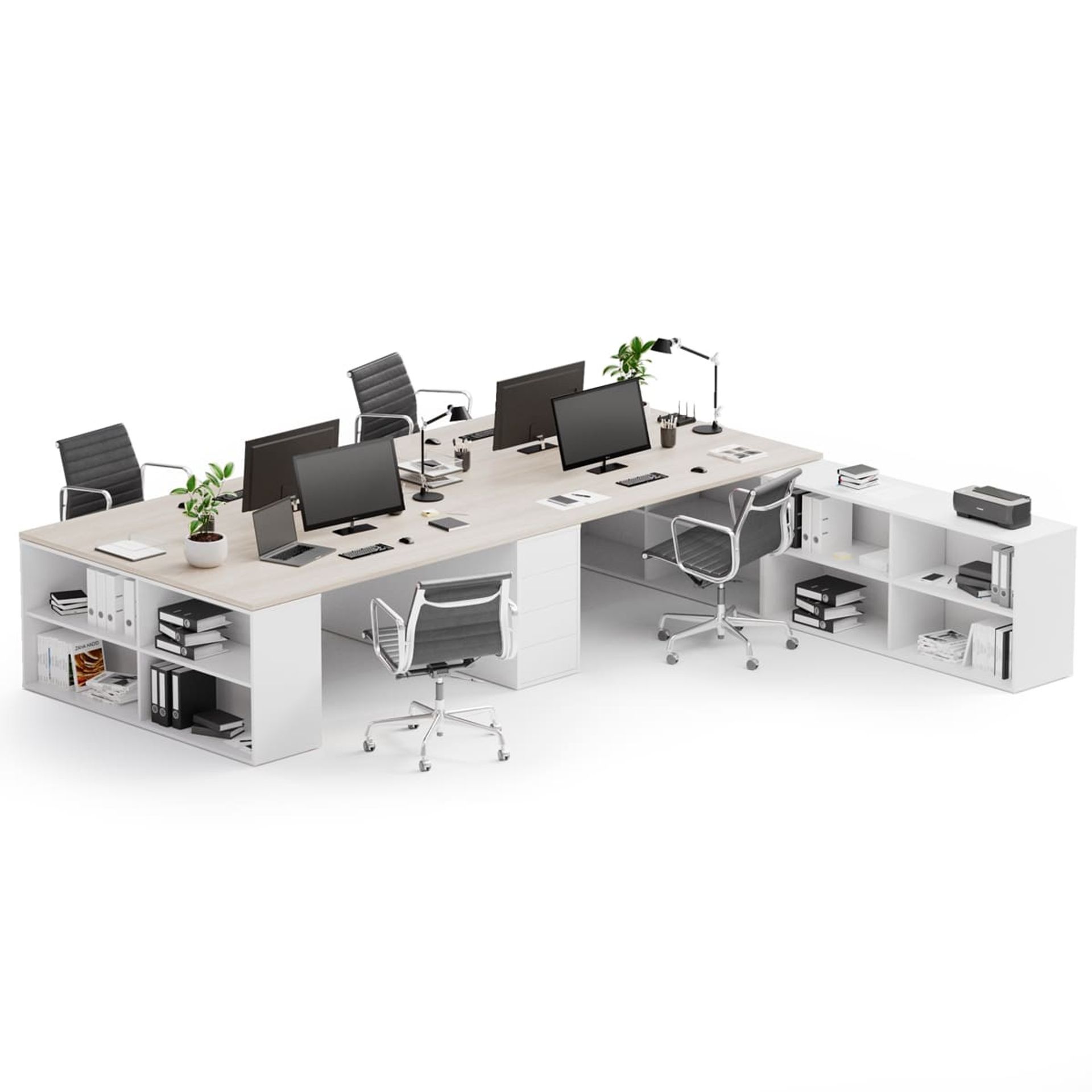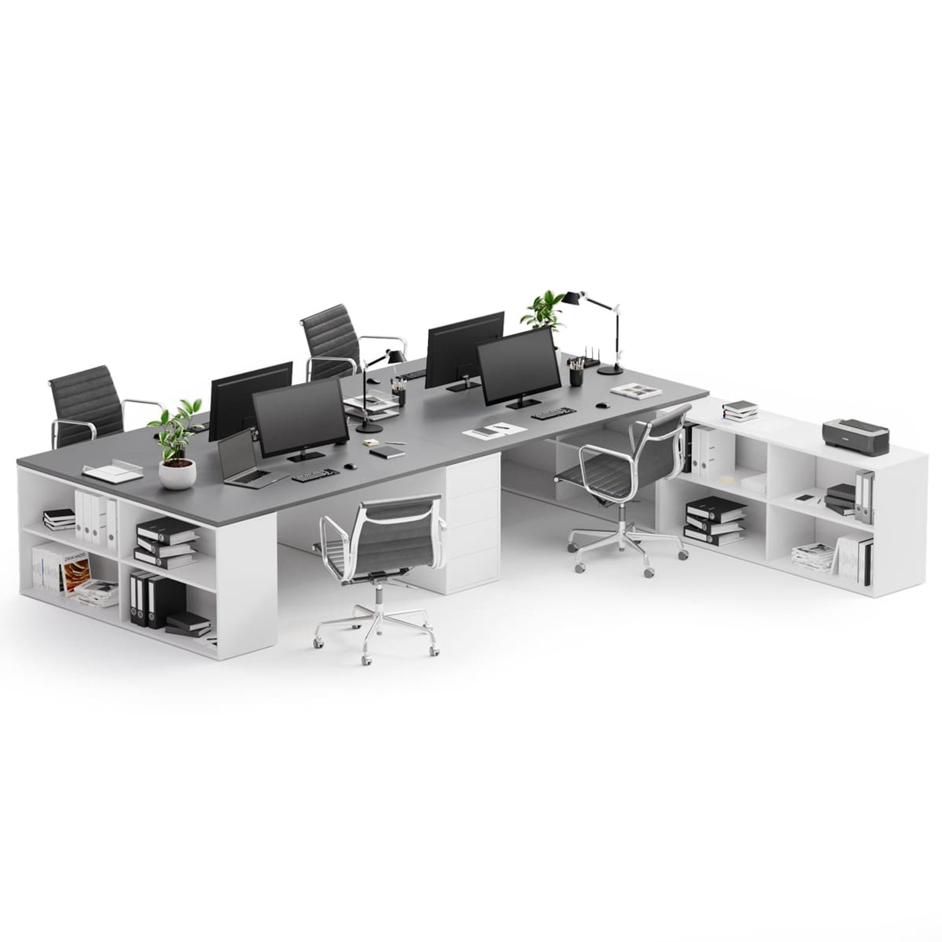 Zestaw składa się z: 3x szafka niska otwarta długa, 2x kontener biurowy z 4 szufladami, 4x blat 1800x800 mm