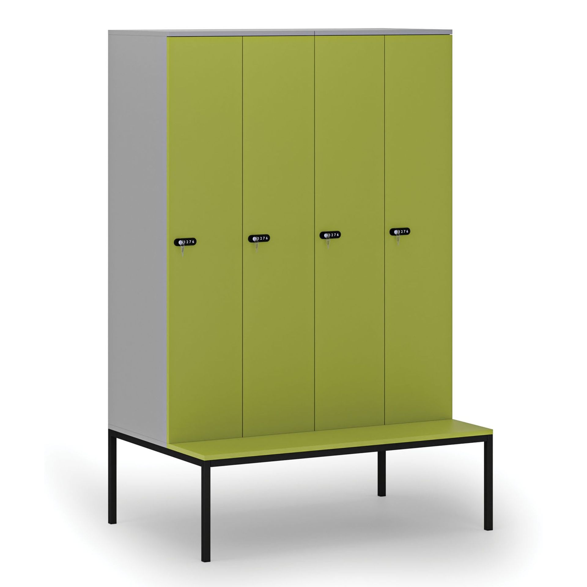 /Wyposażenie szatni/Szafki ubraniowe/Szafki ubraniowe z ławeczką/Drewniana szafa ubraniowa S4 z ławką, 4-drzwiowa, 1871 x 1200 x 500/800 mm, demontaż, zamek mechaniczny z kodem, szary/pomarańczowy