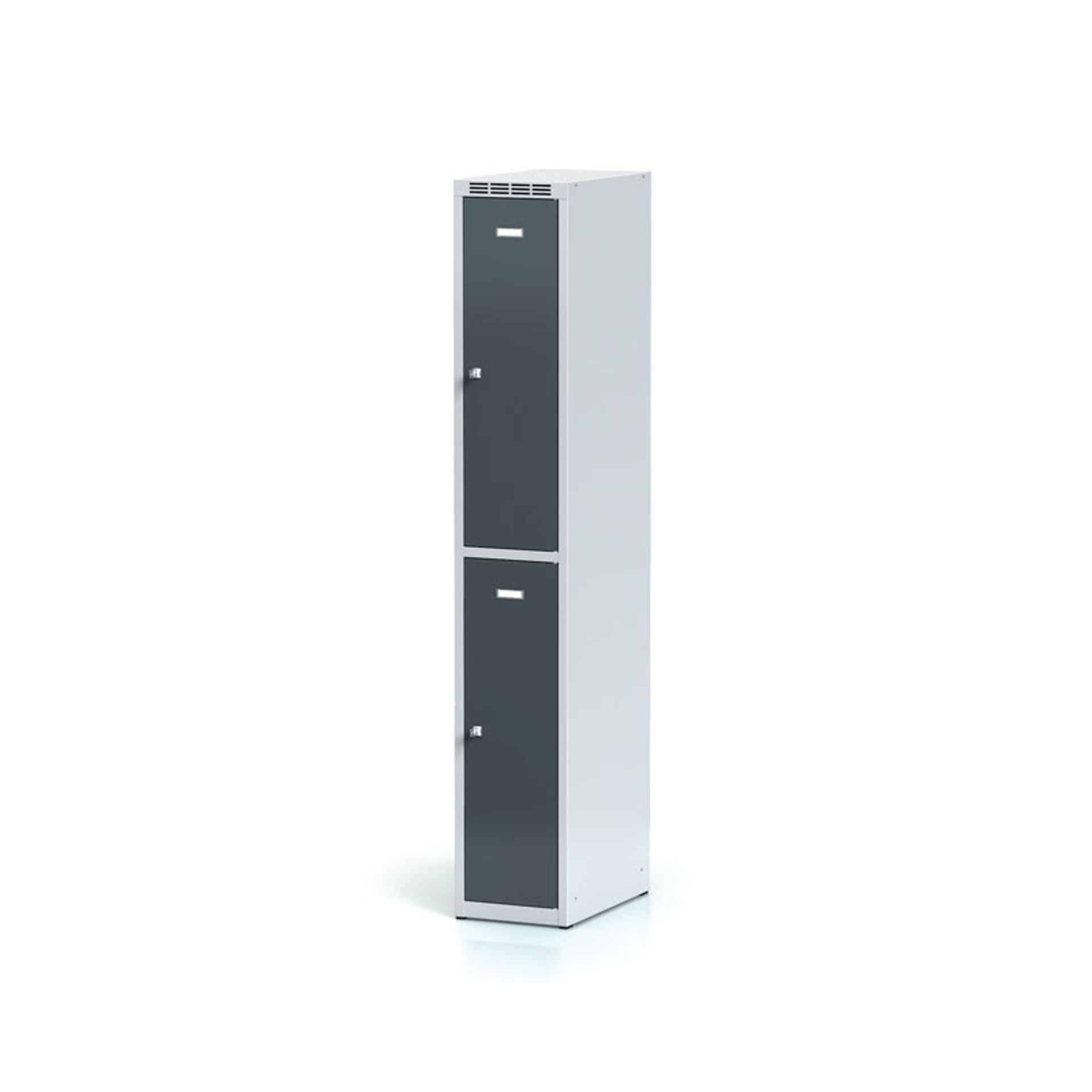 Potrzebujesz pomieścić więcej szafek dla pracowników, gości, uczniów lub studentów i masz ograniczoną przestrzeń? Rozwiązaniem są szafy z 2 przedziałami nad sobą. Szafki te są idealne do szkół, hal sportowych, centrów fitness, na przykład tam, gdzie nie oczekuje się przechowywania odzieży roboczej. Każda komora ma wysokość około 850 mm i jest wyposażona w drążek na ubrania z 2 haczykami. Istnieje możliwość dodania dodatkowej półki.