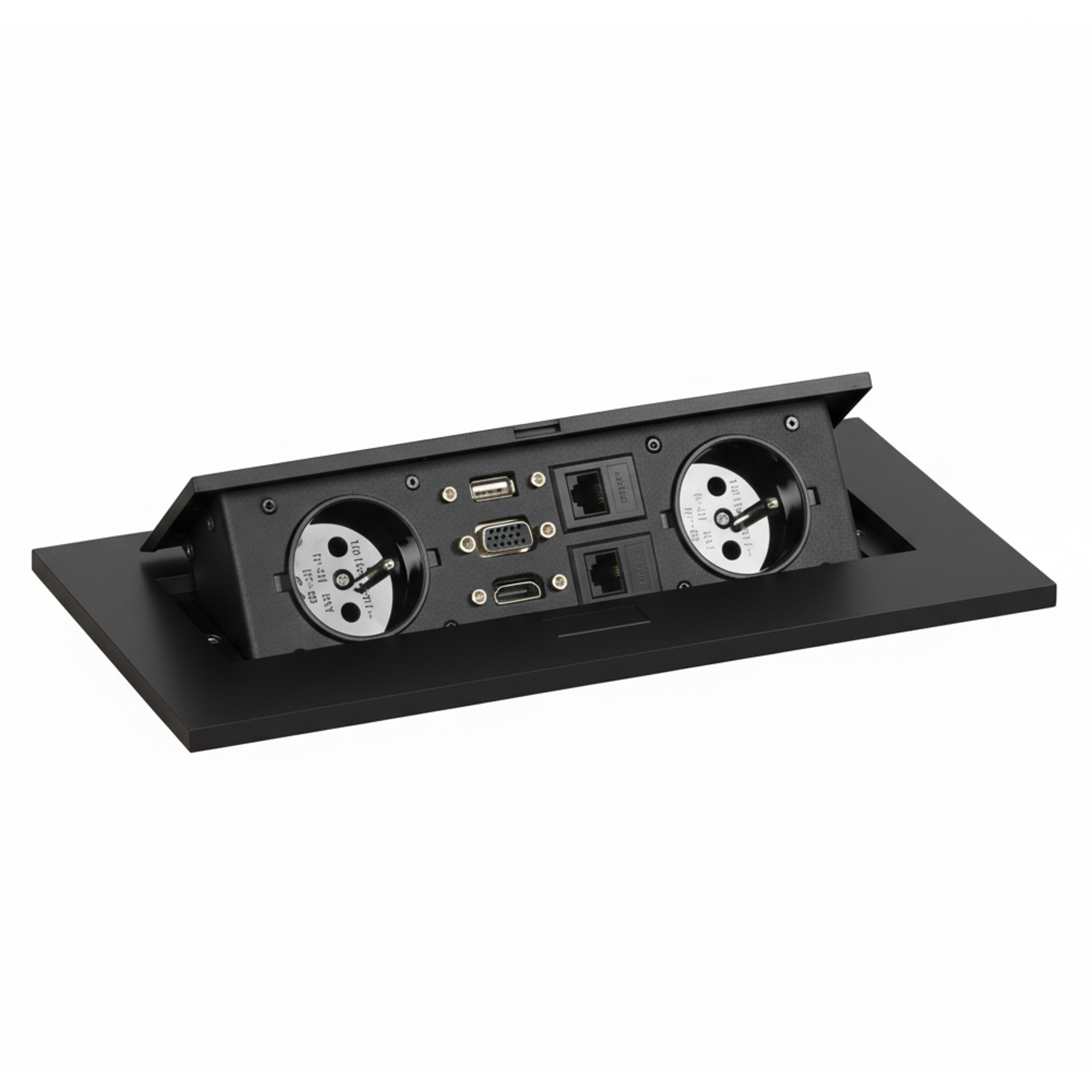 | Zawiera | 2x gniazdo (typ francuski) 110-240V 50/60Hz 10A, 2x port Ethernet (RJ-45) cat5E, port danych USB 2.0, 1x VGA, 1x HDMI |