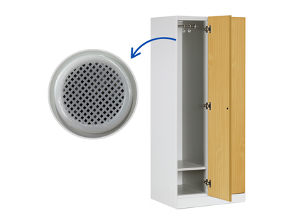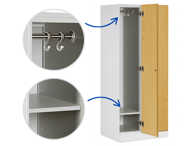 Szafka jest standardowo wyposażona w praktyczne elementy do wygodnego i przejrzystego przechowywania ubrań i rzeczy osobistych. Każda sekcja zawiera: