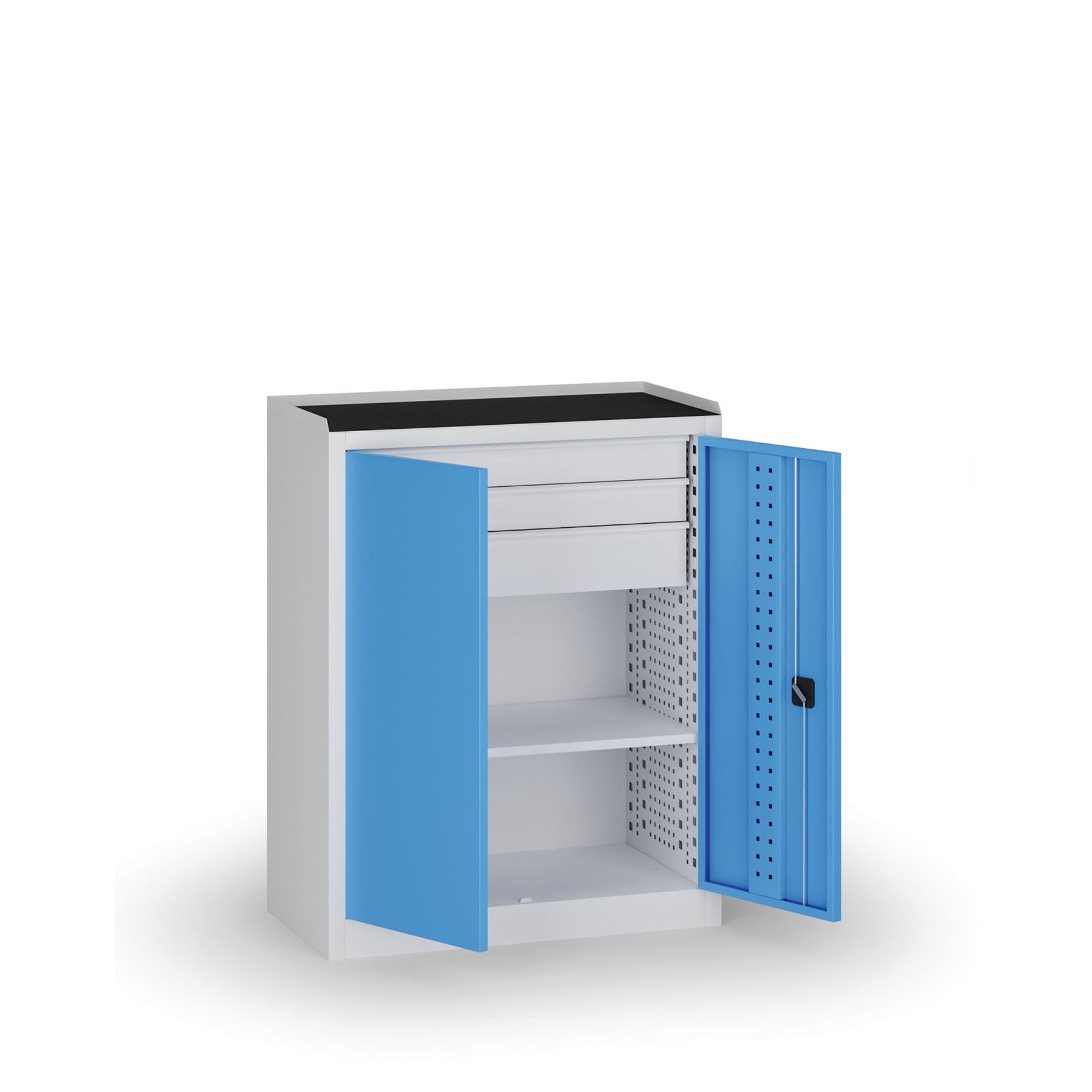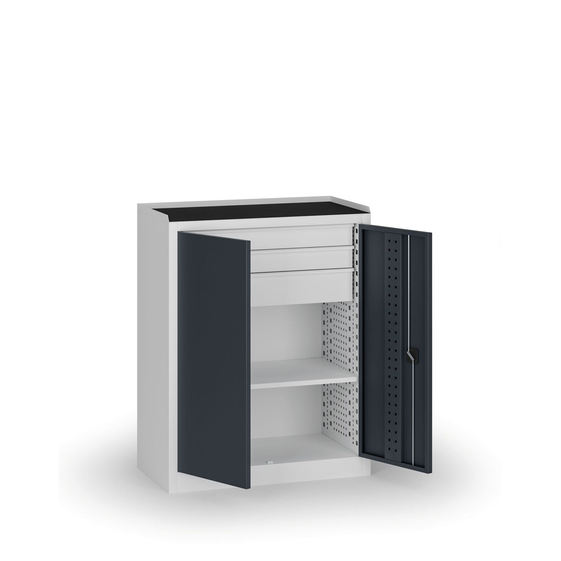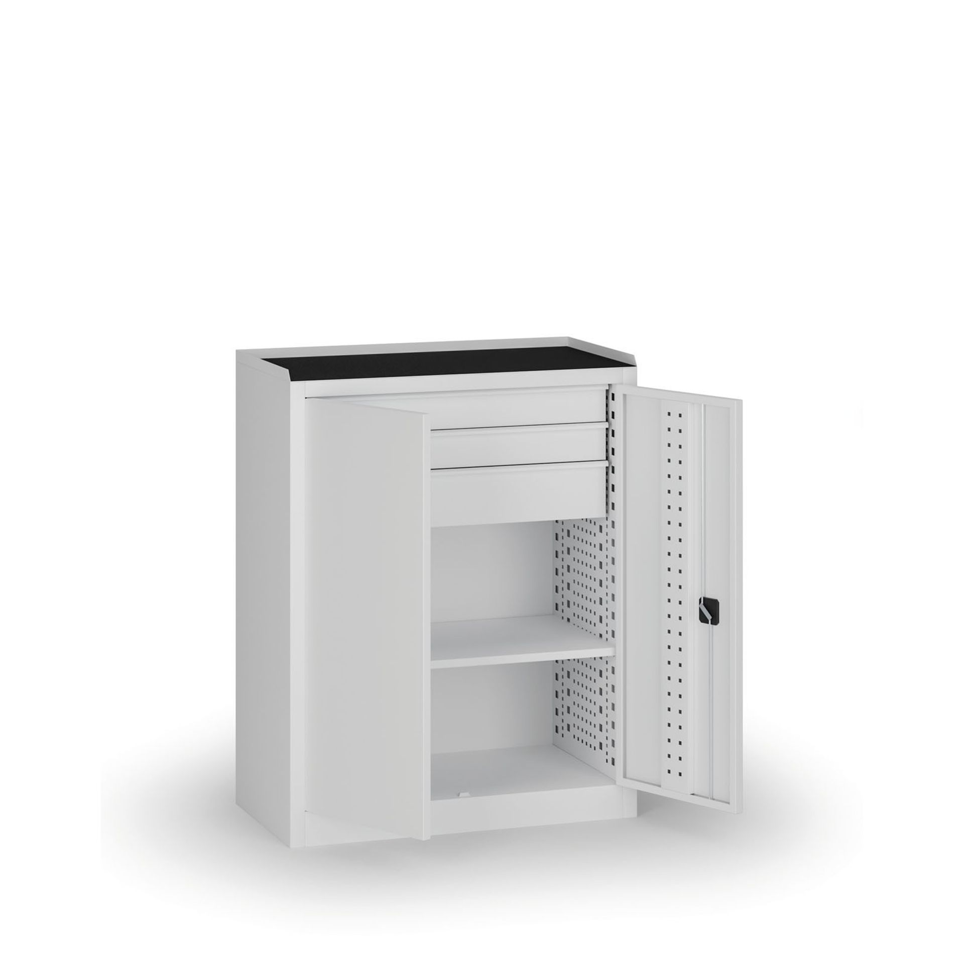 Praktyczna niska szafa warsztatowa łącząca 1 regulowaną półkę i 3 szuflady (2 × 100 mm, 1 × 150 mm). Perforacja w systemie EuroPerfo umożliwia zawieszanie haczyków i uchwytów na bokach i drzwiach. Szuflady o nośności 35 kg mają prowadnice teleskopowe z pełnym wysuwem i regulowanym mocowaniem co 50 mm.