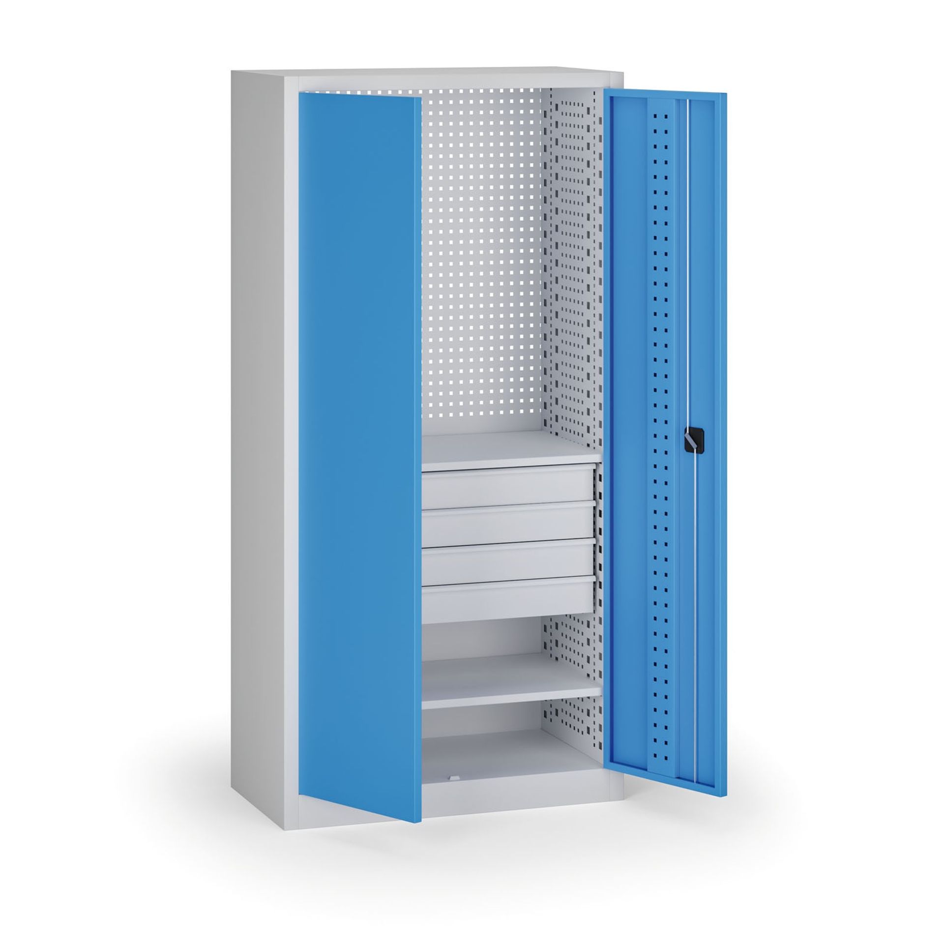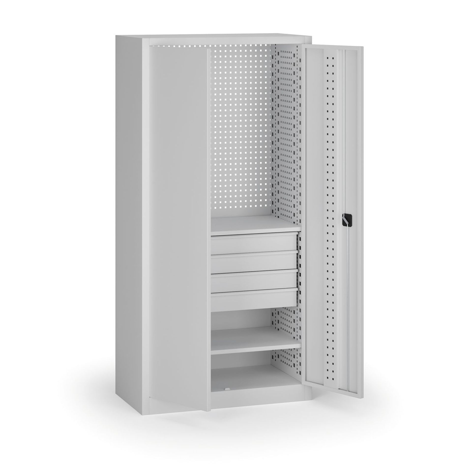 Wysoka szafa z 2 półkami i 4 szufladami (100 mm), perforacja po wewnętrznej stronie drzwi, boków i tylnej ścianki (EuroPerfo 10 × 10 mm, rozstaw 38 × 38 mm), korpus RAL 7035, nośność 400 kg.