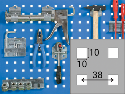 System EUROPERFO to europejski standard paneli perforowanych, umożliwiający przejrzyste i elastyczne rozmieszczenie narzędzi. Otwory o wymiarach 10x10 mm są rozmieszczone w siatce 38x38 mm, co pozwala na łatwy montaż szerokiej gamy haków i uchwytów. System ten można znaleźć m.in. na tylnej ściance lub po wewnętrznej stronie drzwi szaf warsztatowych. W naszej ofercie znajduje się szeroki wybór haków i uchwytów do paneli EUROPERFO.