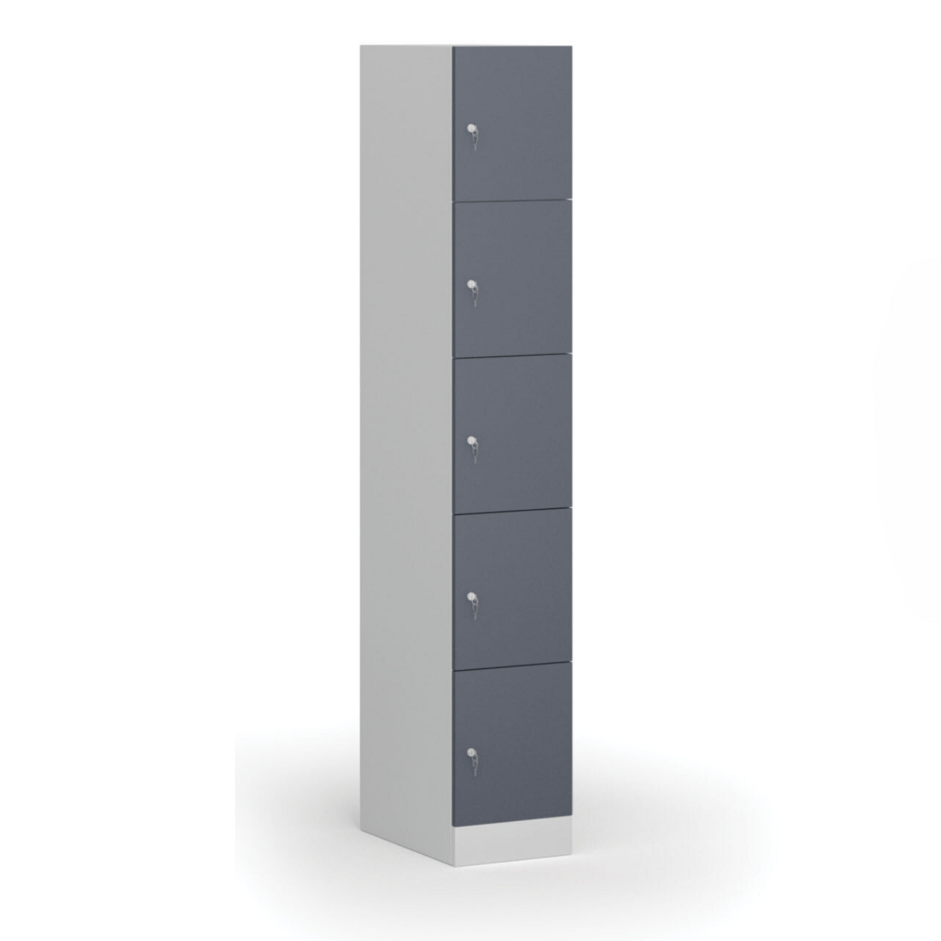 Szafka o szerokości 300 mm składa się z 5 zamykanych skrytek. Każdy boks zapewnia wystarczającą ilość miejsca do przechowywania rzeczy osobistych, plecaków lub toreb. To ekonomiczne, a jednocześnie bezpieczne i zamykane rozwiązanie idealnie sprawdza się wszędzie tam, gdzie trzeba zaoszczędzić miejsce i nie ma potrzeby wieszania dłuższych ubrań.