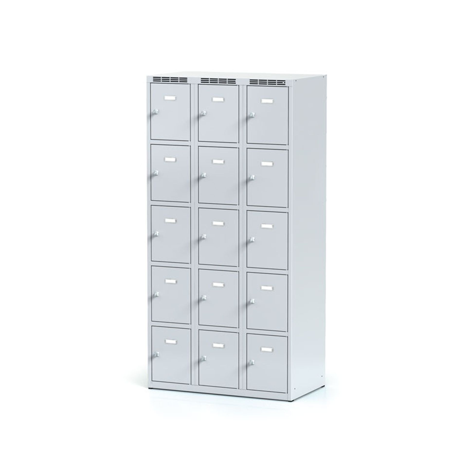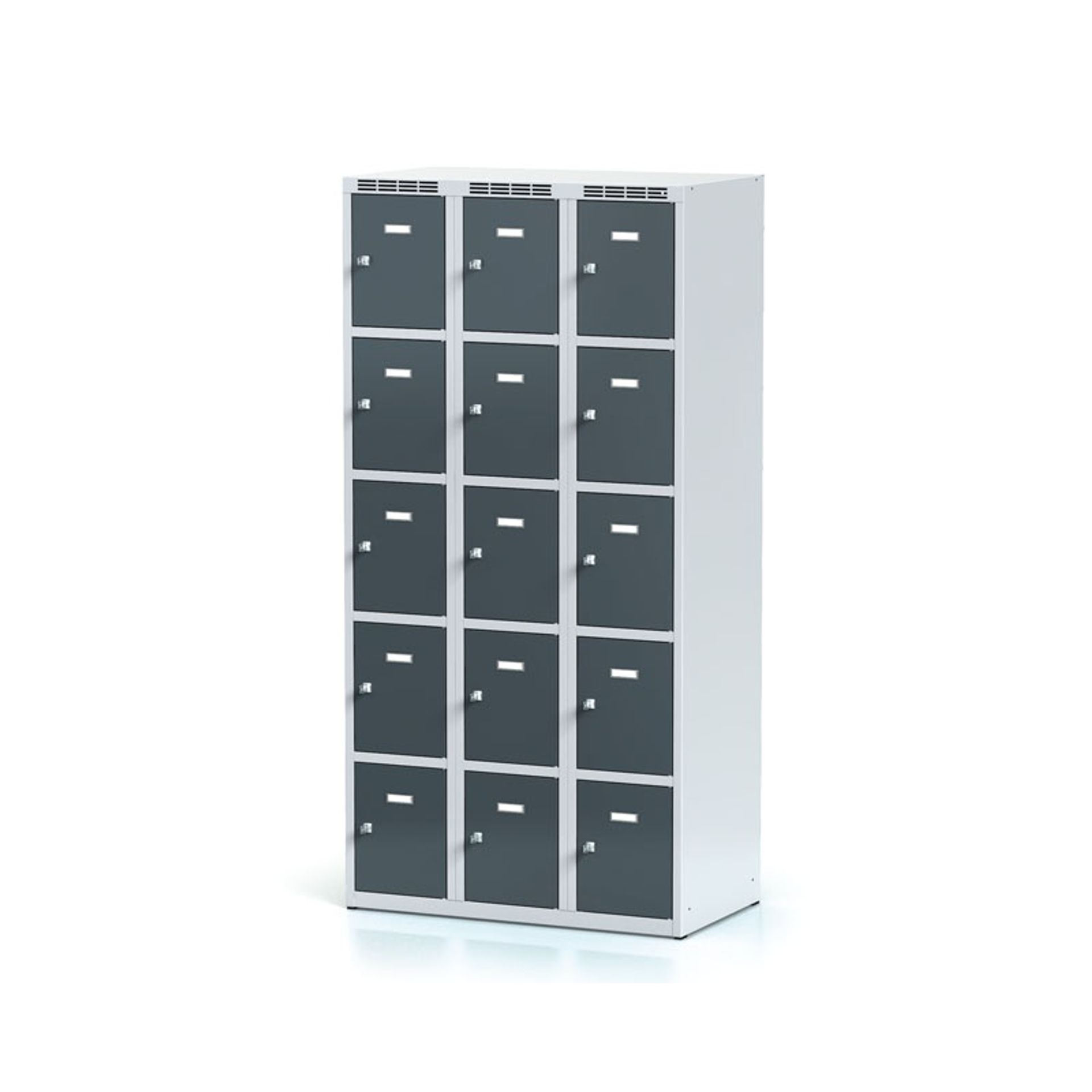 Szafka o szerokości 300 mm składa się z 15 zamykanych skrytek. Każdy boks zapewnia wystarczającą ilość miejsca do przechowywania rzeczy osobistych, plecaków lub toreb. To ekonomiczne, a jednocześnie bezpieczne i zamykane rozwiązanie idealnie sprawdza się wszędzie tam, gdzie trzeba zaoszczędzić miejsce i nie ma potrzeby wieszania dłuższych ubrań.