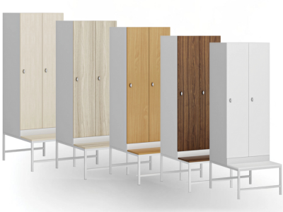Połączenie ławki o wysokości 375 mm i cokołu o wysokości 100 mm przymocowanego do korpusu szafy łączy w sobie ochronę termiczną i wygodne siedzenie. Cokół poprawia izolację termiczną od podłoża, zapobiega osadzaniu się kurzu i wilgoci, a ławka zapewnia wygodę podczas przebierania się bezpośrednio przy szafce.