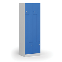 Szafy z drzwiami w kształcie litery Z są wyposażone w zamek bębenkowy lub obrotowy. Wraz z kolorem możesz również wybrać, czy chcesz, aby Twoja szafka była bez podstawy, na cokole lub na nóżkach.